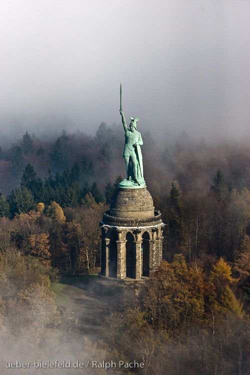 Wir kommen zum Schluss noch mal kurz zum Cherusker Fürsten Arminius, der vor ein paar hundert Jahren zum Hermann mutierte und jetzt als Denkmal in der Nähe von Detmold steht. Na gut, die Schlacht war wahrscheinlich nicht am Teutoburger Wald sondern in Kalkriese bei Osnabrück. Aber beim Hermann waren wir natürlich auch und haben ihn aus der Luft abgelichtet. Schließlich hat man das Hermannsjahr 2009 angekündigt.